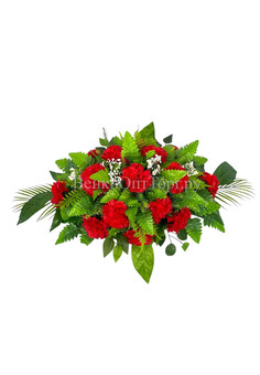 Классическая кремационная композиция на гроб, красные искусственные гвоздики, длина 95 см.